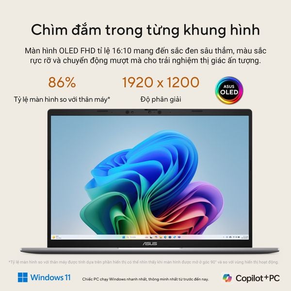 Màn hình OLED 14 inch WUXGA là điểm mạnh vượt trội, với độ phủ màu 95% DCI-P3 , tỷ lệ tương phản 1.000.000:1 , và tốc độ phản hồi siêu nhanh chỉ 0.2ms , lý tưởng cho công việc thiết kế, chỉnh sửa ảnh chuyên nghiệp và giải trí đa phương tiện.
