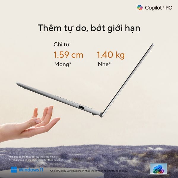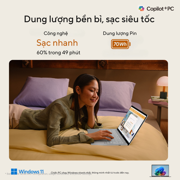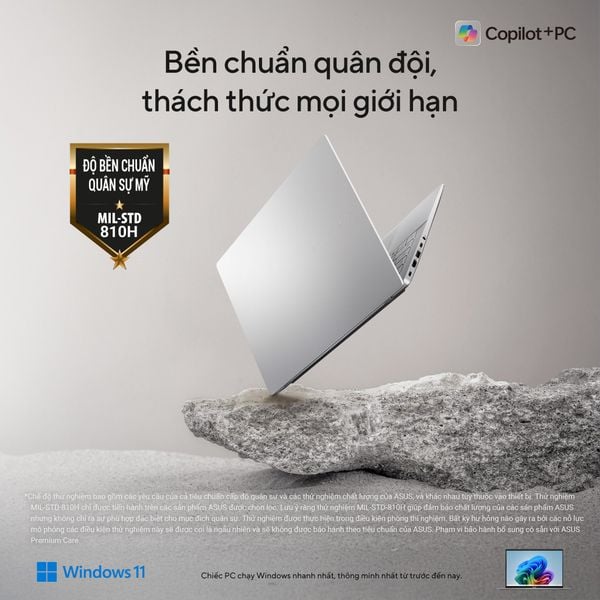 Vivobook S14 đã vượt qua tiêu chuẩn độ bền quân đội US MIL-STD 810H , đảm bảo khả năng chống chịu va đập, rung lắc và vận hành ổn định trong môi trường làm việc khắc nghiệt. Bàn phím Chiclet có đèn nền giúp thao tác thuận tiện trong điều kiện thiếu sáng, đồng thời tích hợp phím Copilot riêng giúp truy cập nhanh các tính năng AI.
