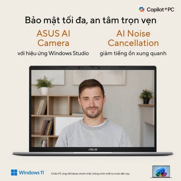 Máy tích hợp Camera FHD IR cho đăng nhập khuôn mặt Windows Hello, Micro khử tiếng ồn AI , và bảo mật nền tảng Microsoft Pluton cùng các tính năng AI thông minh như Adaptive Lock, đảm bảo an toàn dữ liệu doanh nghiệp.