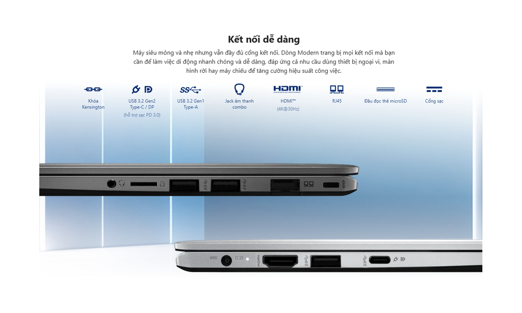 Modern 14 F13MG được trang bị đầy đủ các cổng kết nối: