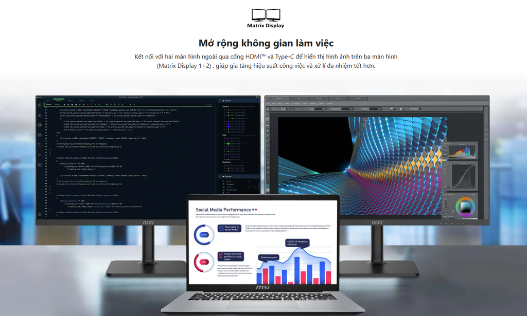 Một trong những điểm nổi bật trên MSI Modern 14 F13MG là công nghệ Matrix Display , giúp mở rộng không gian làm việc bằng cách xuất hình ảnh ra hai màn hình ngoài thông qua cổng HDMI và USB Type-C